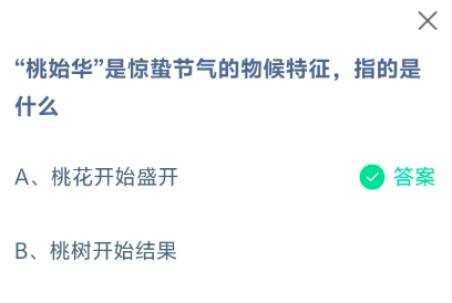 “桃始华”是惊蛰节气的物候特征,指的是什么?这是今天《支付宝》每日一题的问题,相信我们很多用户都很想知道这个问题的答案是什么?这么一个可以领取饲料的机会相信我们很多用户都不想错过,这里指玩手游网的小编为你带来了2026《支付宝》3月5日每日一题最新答案介绍(1)的全部内容,喜欢的小伙伴欢迎点击进入看看吧。