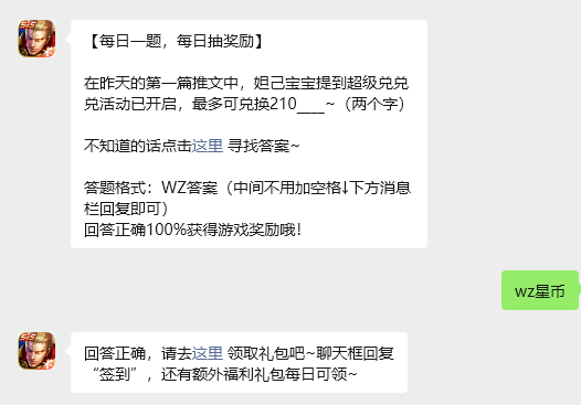 在昨天的第一篇推文中,妲己宝宝提到超级兑兑兑活动已开启,最多可兑换210____~(两个字)