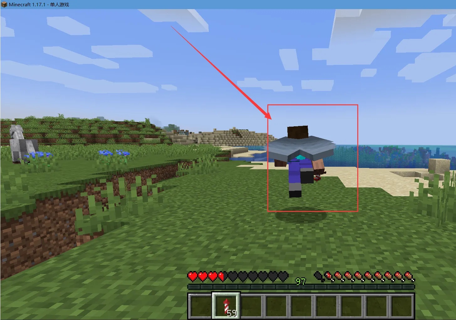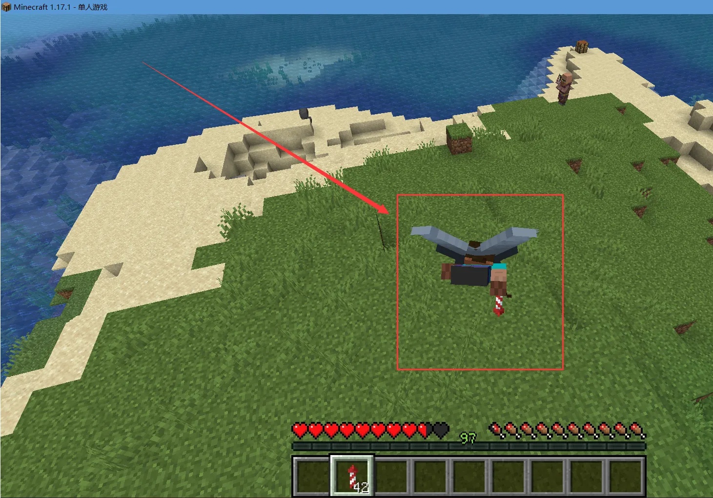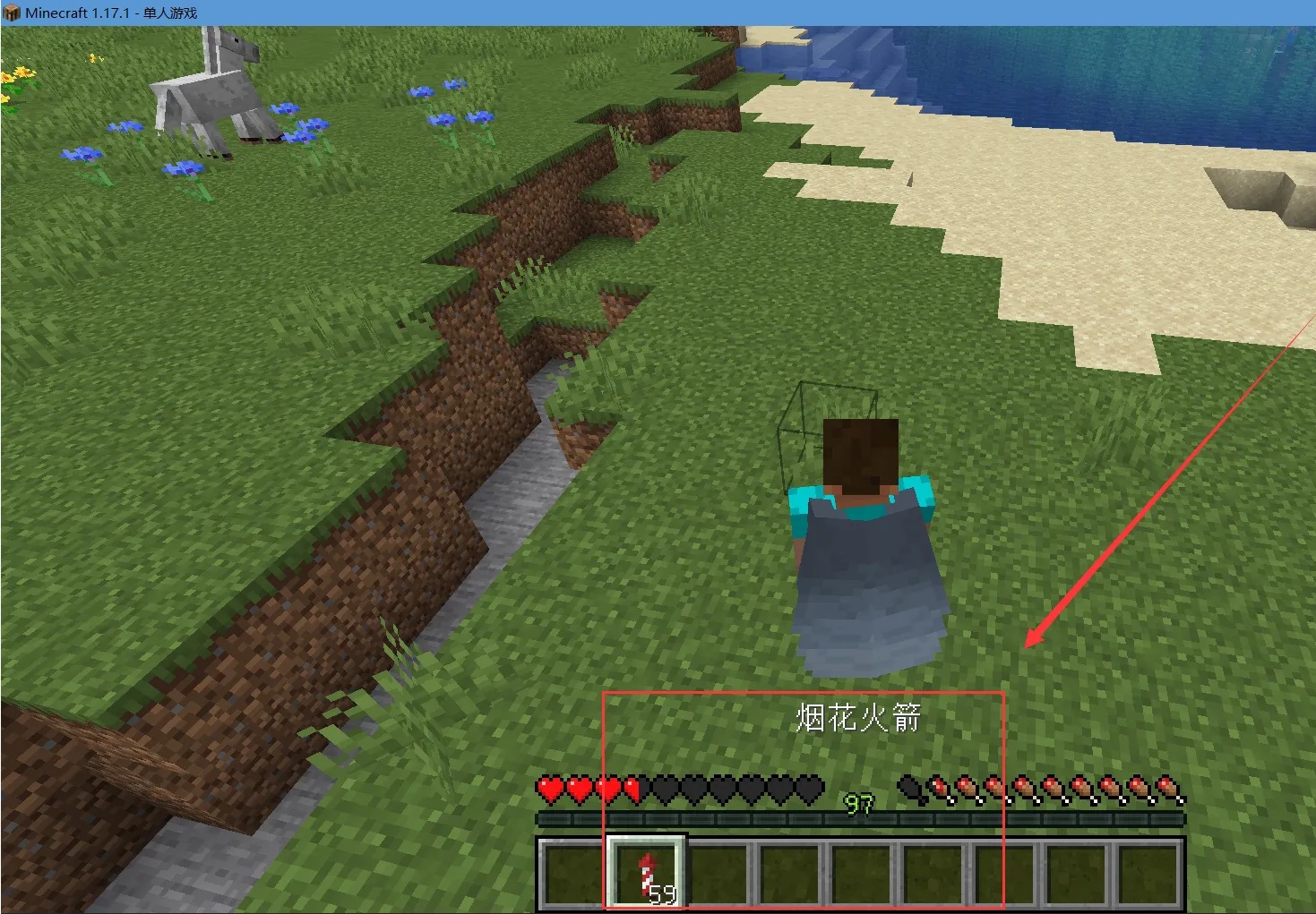 1、装备鞘翅,手持烟花火箭。