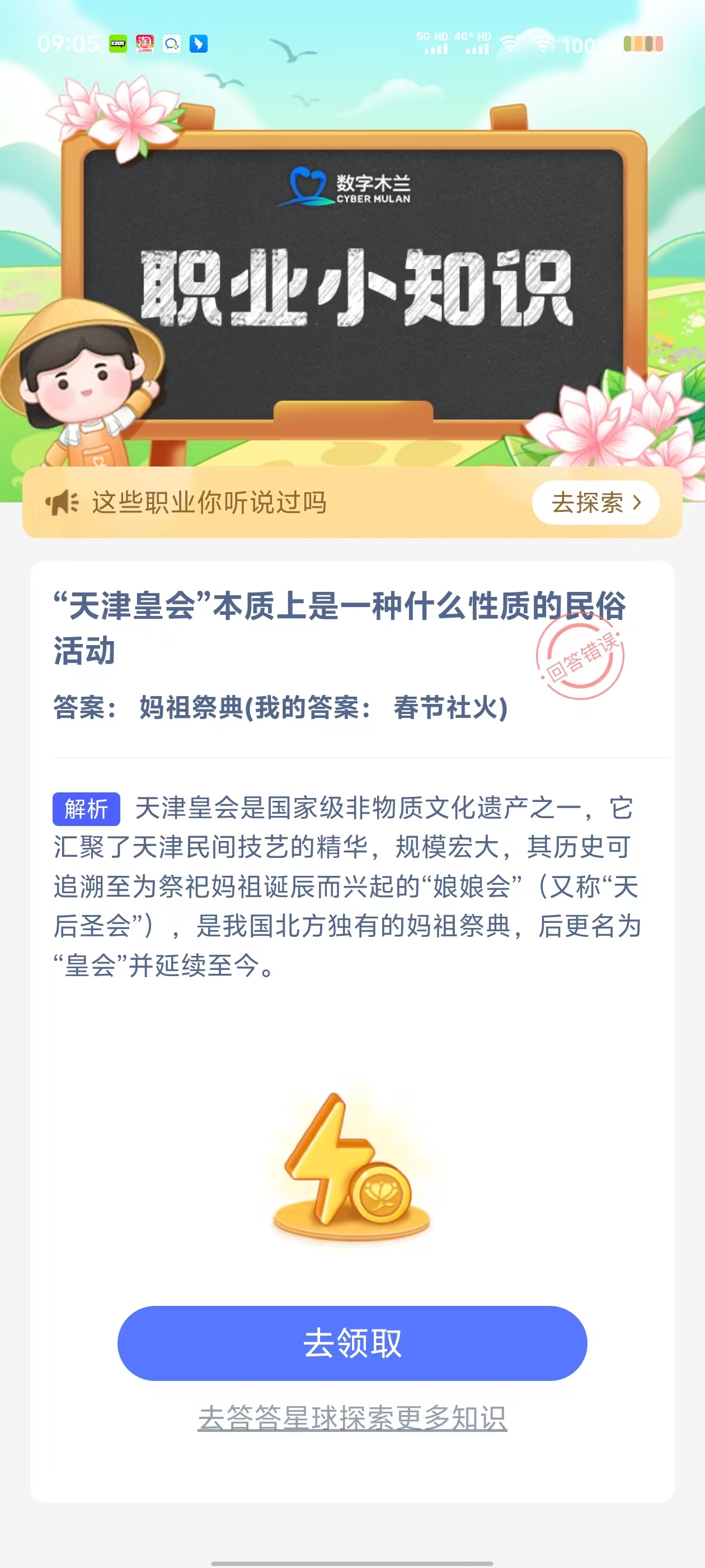 2、在【职业小知识问答】对话框中,点击【去完成】进入答题页面;
