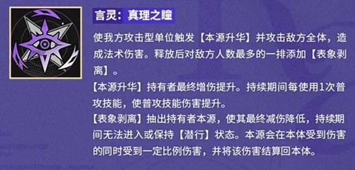 释放后,为我方全体攻击型单位施加“本源升华”,大幅提升最终增伤;对敌方全体造成法术伤害,并在敌方人数最多一排施加“表象剥离”。该状态可阻止潜行单位行动,同时触发“本源共伤”,将伤害二次放大。