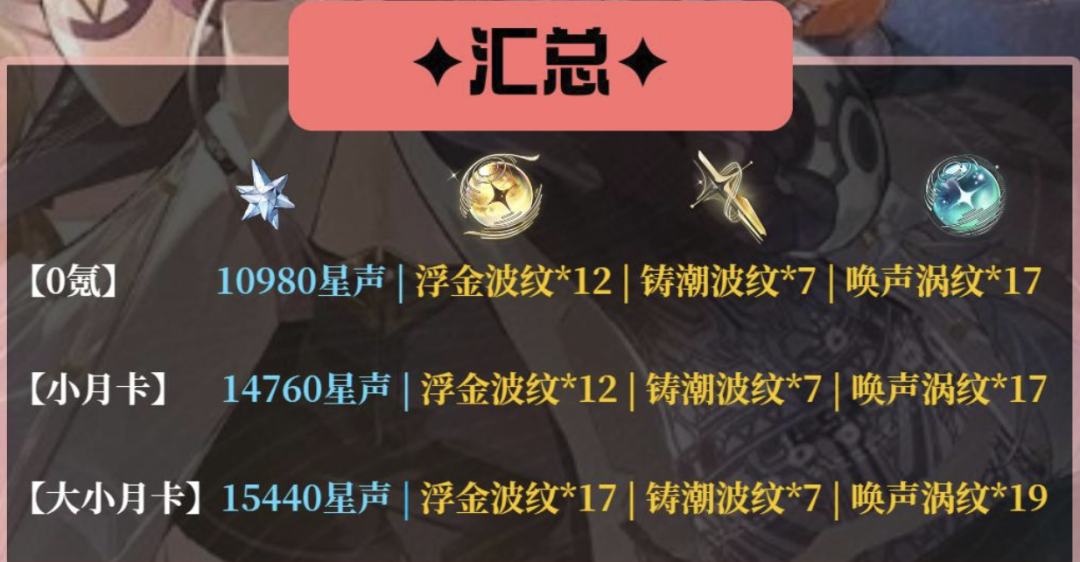 零氪玩家:总计10980星声 + 浮金波纹12 + 铸潮波纹7 + 唤声涡纹*17