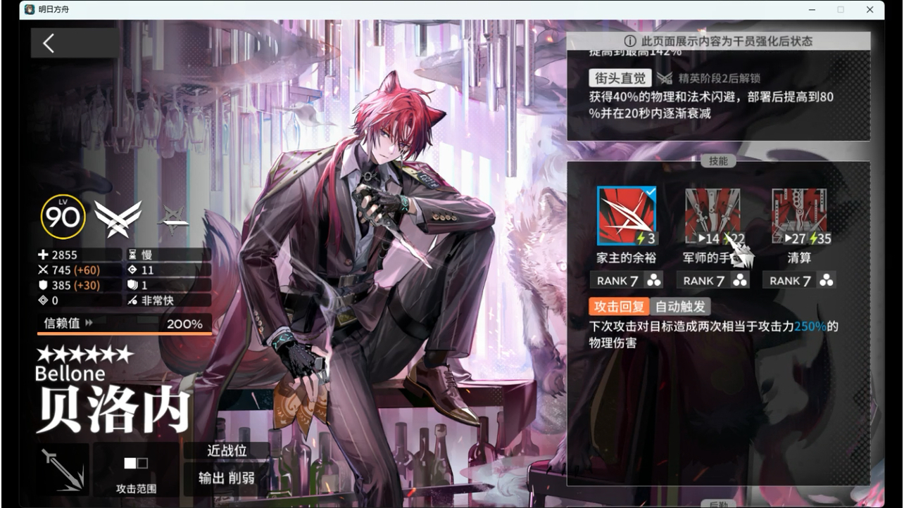 清算(三技能核心):提升攻击力与攻击速度,并有几率造成更高伤害。激活瞬间可瞬移至范围内目标并攻击,对精英/领袖敌人击倒或空闲数秒后重新选取目标。受到致命伤害时技能强制结束,并返回初始部署位置。