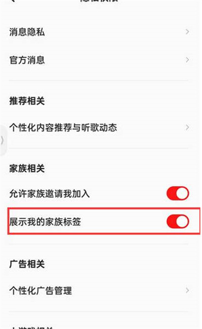 找到“展示我的家族标签”,点击右侧滑块开启