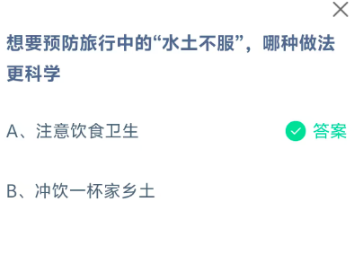 想要预防旅行中的“水土不服”,哪种做法更科学?用户们答对问题即可获得饲料,那么现在就让指玩手游网的小编为大家带来关于《支付宝》10月19日每日一题最新答案介绍(2)的全部内容吧,感兴趣的小伙伴一定不要错过哦。