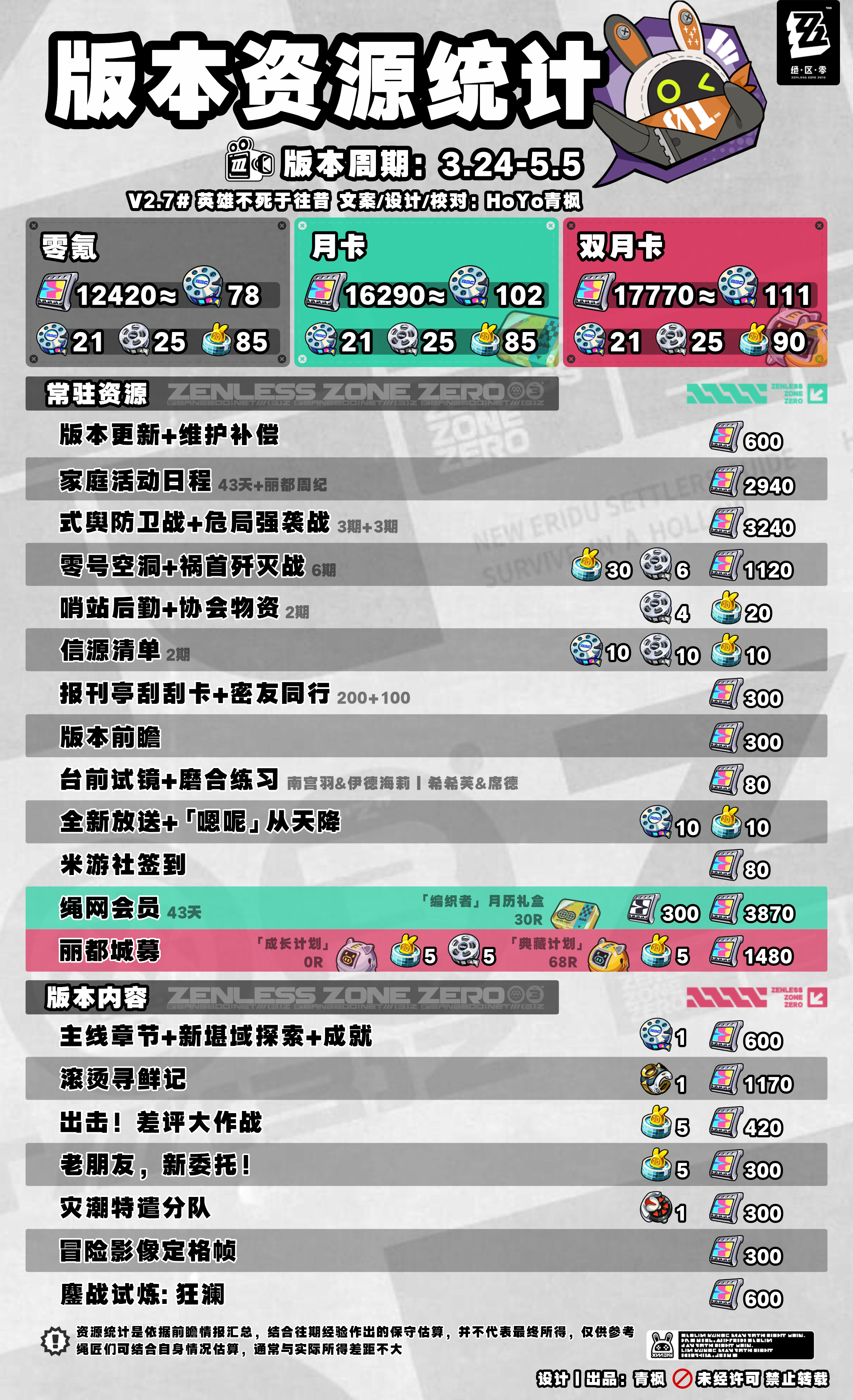 版本资源图鉴是根据前瞻情报总结,结合以往经验做出的预估算,通常实际所得会略高于本统计,整体差距不大可结合自身情况做出相应的估算;