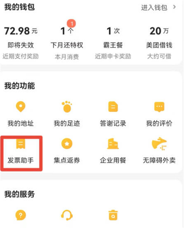 我们打开美团外卖,然后点击右下角我的选项,然后我们点击里面的发票助手功能。
