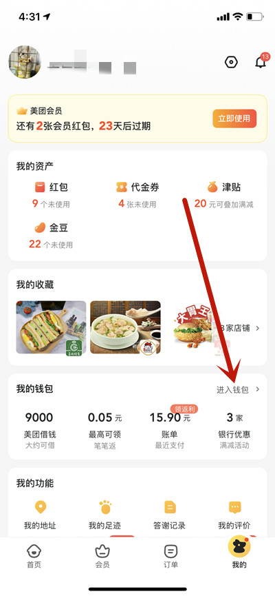 打开美团外卖,点击 “我的” → “我的钱包”。