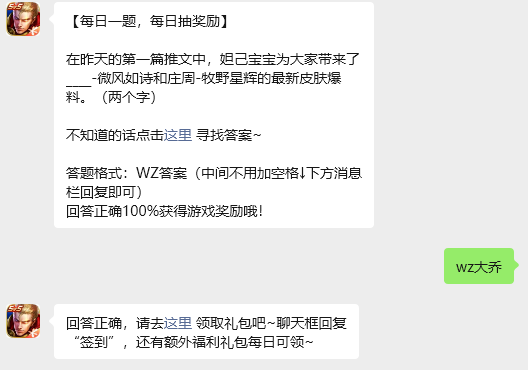 在昨天的第一篇推文中,妲己宝宝为大家带来了____-微风如诗和庄周-牧野星辉的最新皮肤爆料。(两个字)