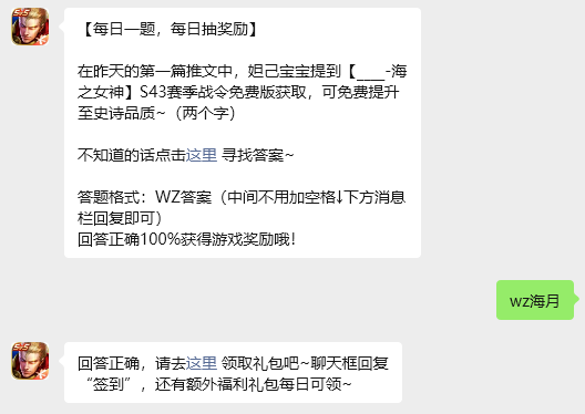 在昨天的第一篇推文中,妲己宝宝提到【____-海之女神】S43赛季战令免费版获取,可免费提升至史诗品质~(两个字),玩家只需要回答对今日的问题,即可获取游戏奖励,那么答案到底是什么呢?现在就让指玩手游网的小编为大家带来关于2026《王者荣耀》4月1日每日一题答案介绍的全部内容吧,感兴趣的小伙伴一定不要错过哦。