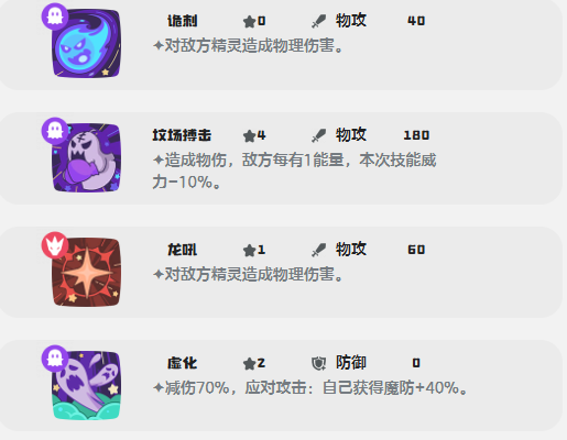 坟场搏击:基础威力180,高耗能高回报技能,需结合敌方能量状态择机释放。