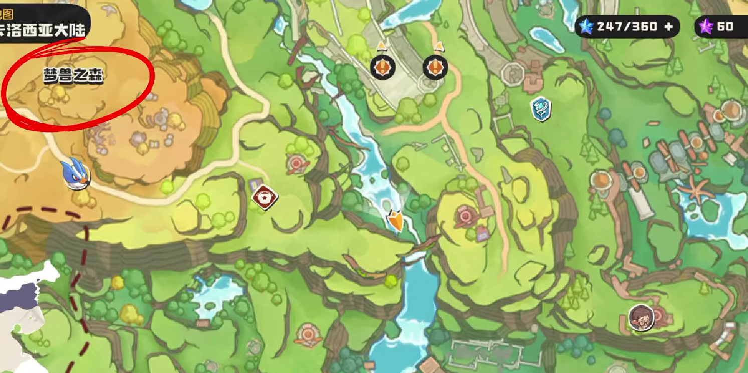 玩家可借助传送机制直接来到梦兽之森。进入后沿地图右侧前行,会看到一个显眼的瀑布,必经路口就在瀑布下方水域附近。
