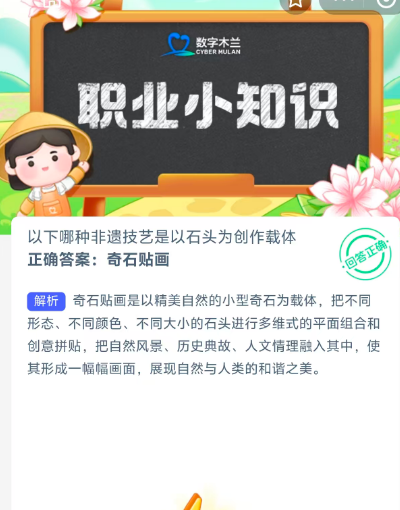 以下哪种非遗技艺是以石头为创作载体?蚂蚁新村每日一题2025年10月20日题目已发布!只要答对这个问题即可加速产币,获取足够木兰币即可加速小镇建设,那么今天的问题答案是什么呢?现在就让指玩手游网的小编为大家带来关于2025《蚂蚁新村》10月20日答案分享的全部内容吧,感兴趣的小伙伴一定不要错过哦。