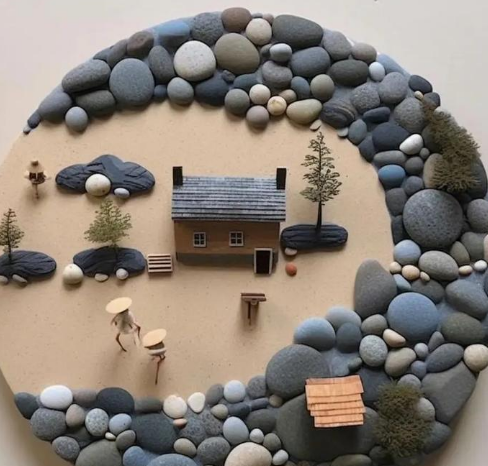 创意拼贴:通过对不同颜色、形状、大小的石头进行组合与布局,在平面上构图,形成如山水风景、人物形象、民俗故事等画面。