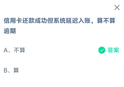 信用卡还款成功但系统延迟入账,算不算逾期?这是今天《支付宝》每日一题的问题,相信我们很多用户都很想知道这个问题的答案是什么?这么一个可以领取饲料的机会相信我们很多用户都不想错过,这里指玩手游网的小编为你带来了2026《支付宝》4月7日每日一题最新答案介绍(1)的全部内容,喜欢的小伙伴欢迎点击进入看看吧。