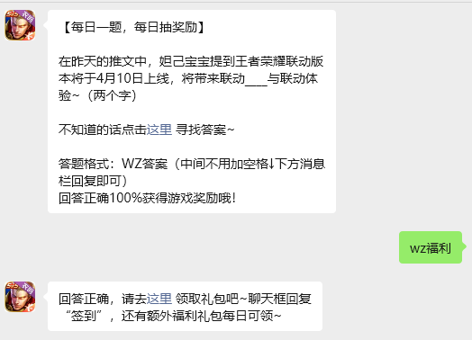 在昨天的推文中,妲己宝宝提到王者荣耀联动版本将于4月10日上线,将带来联动____与联动体验~(两个字)