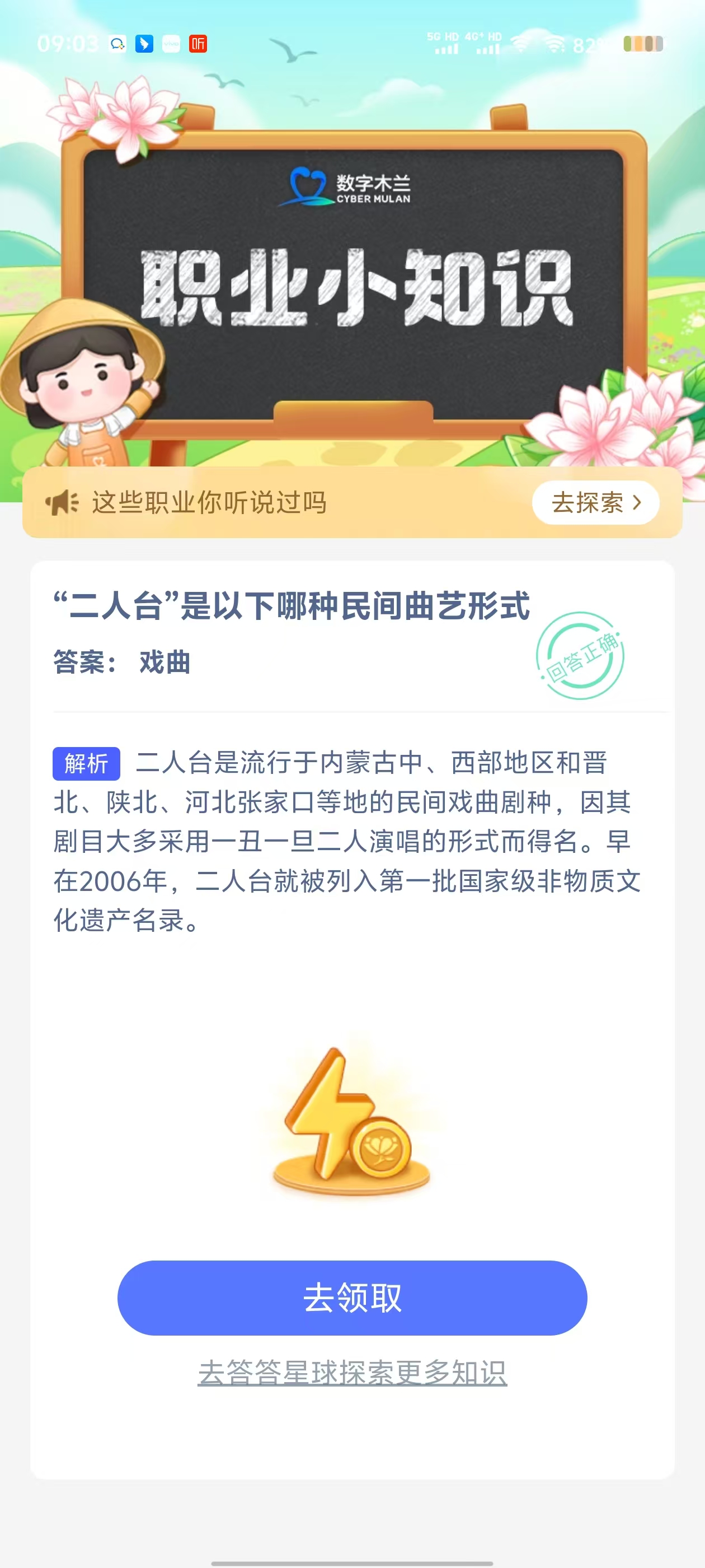 2、在【职业小知识问答】对话框中,点击【去完成】进入答题页面;