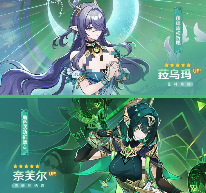 第二期:菈乌玛 + 奈芙尔。菈乌玛是草元素法器辅助,战略价值较高;奈芙尔则为草系主C,两者在体系上有较强联动性。