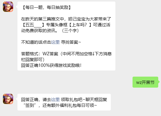 在昨天的第三篇推文中,妲己宝宝为大家带来了【五五____】专属头像框【上车吗?】可通过活动免费获取的资讯。(三个字)