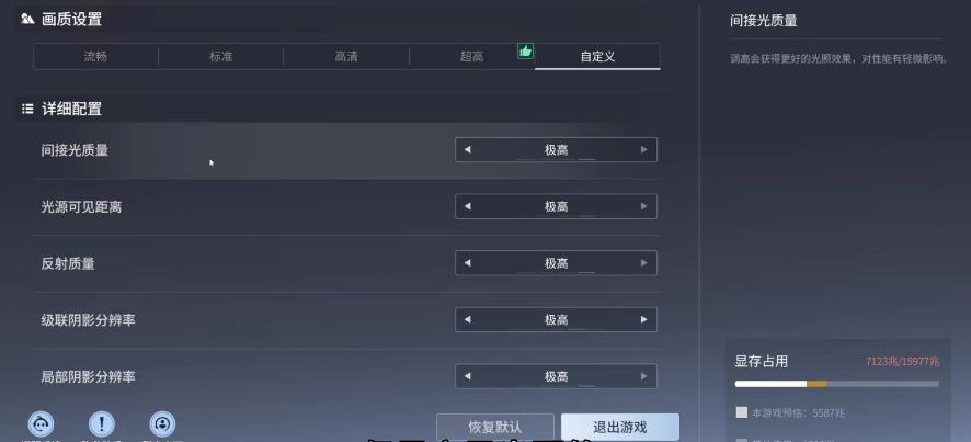 间接光与阴影:间接光设置为极高,阴影设置为高,能增强画面细节。