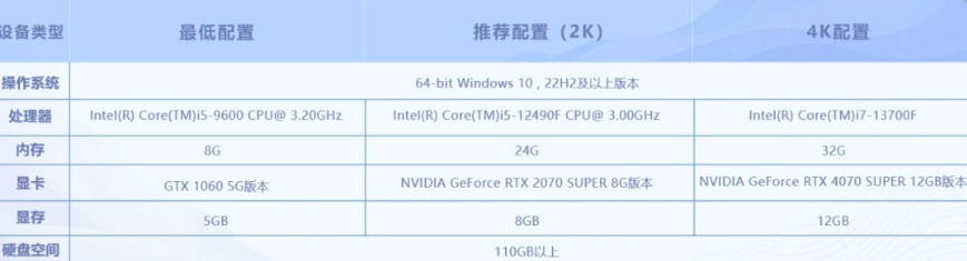 4K画质:处理器I7-13700F,内存32GB,显卡RTX 4070 SUPER 12GB,硬盘空间同样需110GB以上。