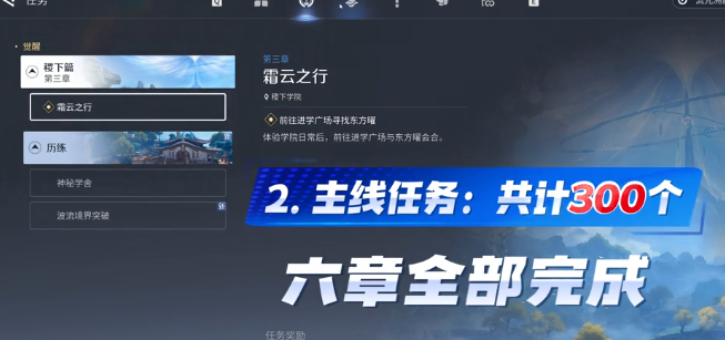 当前开放至6章主线,全部通关可获得约300资源。主线不仅推动剧情发展,还能同步获取基础资源,是开荒阶段不可跳过的核心内容。