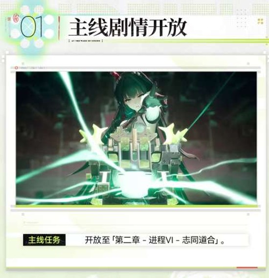 随着「春晓时」版本的上线,主线任务将开放至第二章进程VI「志同道合」。博士与干员们将继续面对新挑战,深入探索充满危机与机遇的终末地。