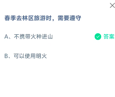 春季去林区旅游时,需要遵守?这是今天《支付宝》每日一题的问题,相信我们很多用户都很想知道这个问题的答案是什么?这么一个可以领取饲料的机会相信我们很多用户都不想错过,这里指玩手游网的小编为你带来了2026《支付宝》4月16日每日一题最新答案介绍(1)的全部内容,喜欢的小伙伴欢迎点击进入看看吧。