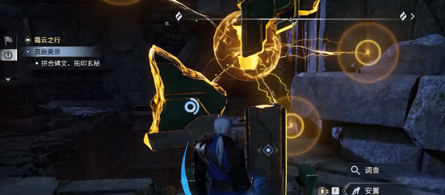 每块石构件旁设有蓝色牵引装置,需先拾取并附着于石块才能搬运和拼合。完成所有石块归位和结构校准后,剧情自动推进。