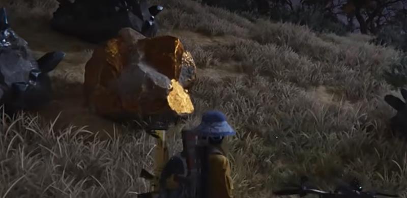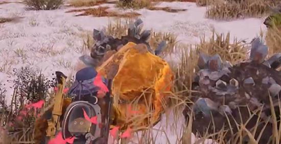 接近白色区域后,沿着湖泊边缘搜索,很容易发现金矿。金矿颜色偏亮,和环境对比明显,辨识度高,附近还常见其他矿种一同生成。