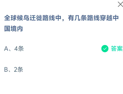 全球候鸟迁徙路线中,有几条路线穿越中国境内?这是今天《支付宝》每日一题的问题,相信我们很多用户都很想知道这个问题的答案是什么?这么一个可以领取饲料的机会相信我们很多用户都不想错过,这里指玩手游网的小编为你带来了2026《支付宝》4月17日每日一题最新答案介绍(1)的全部内容,喜欢的小伙伴欢迎点击进入看看吧。