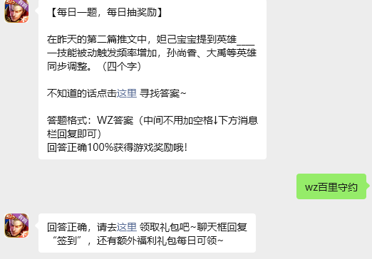 在昨天的第二篇推文中,妲己宝宝提到英雄____一技能被动触发频率增加,孙尚香、大禹等英雄同步调整。(四个字)