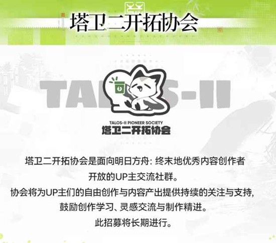「塔卫二开拓协会」长期开放,面向优质内容创作者提供交流与扶持资源,适合希望持续深耕《明日方舟:终末地》内容的玩家加入。