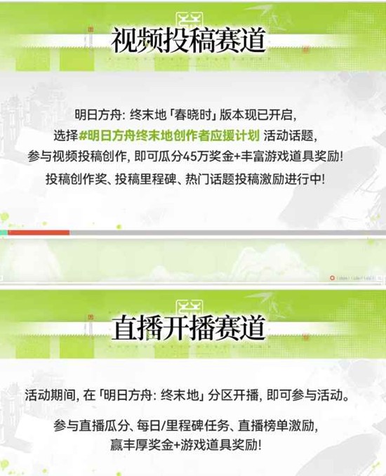 在活动期间开播「明日方舟:终末地」分区,完成每日与阶段任务,并参与榜单竞争,即可获取奖金及游戏道具奖励。