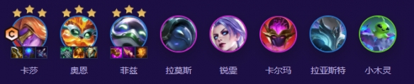 以卡莎为主C,核心成员:卡莎、奥恩、菲兹、拉莫斯、锐雯、卡尔文、拉亚斯特、小木灵