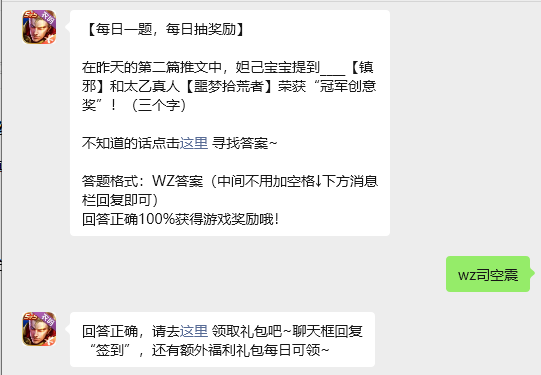 在昨天的第二篇推文中,妲己宝宝提到____【镇邪】和太乙真人【噩梦拾荒者】荣获“冠军创意奖”!(三个字)