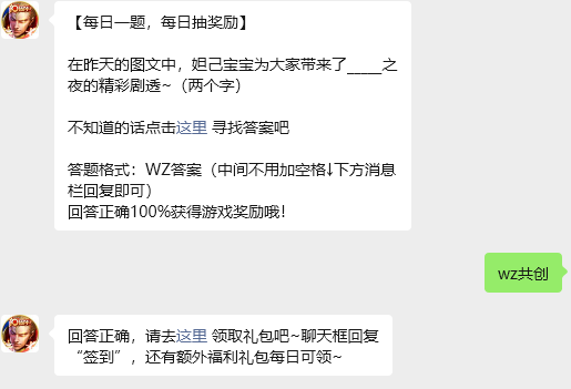今日问题:在昨天的图文中,妲己宝宝为大家带来了_____之夜的精彩剧透~(两个字)