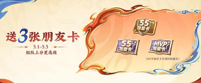 领取3张朋友卡(55保星卡、55加星卡、MVP加星卡),组队上分更高效。