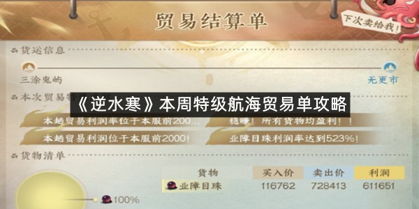 以上就是指玩手游网小编为你带来的《逆水寒》本周特级航海贸易单攻略的全部内容,更多精彩游戏资讯攻略尽在指玩手游网,感兴趣的小伙伴欢迎点击关注收藏本网站哦。
