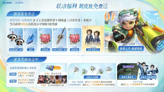 核心福利方面,活动时间为4月23日至5月20日。期间,玩家在《王者荣耀世界》的“朝闻道”日常任务中,当日累计获得120点活跃度即可领取阶段奖励。