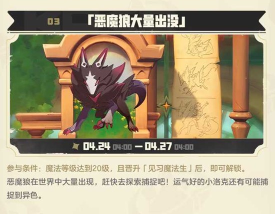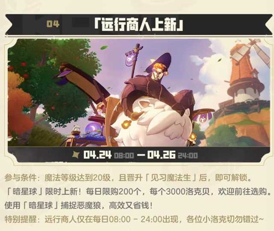 恶魔狼将在世界中大量出现,捕捉成功有机会获得异色精灵。同步开启「远行商人」限时上架「暗星球」道具,助力捕捉。