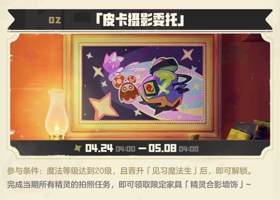 魔法等级达到20级并晋升为「见习魔法生」后解锁。完成所有精灵拍照任务即可获得限定家具「精灵合影墙饰」。