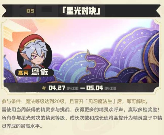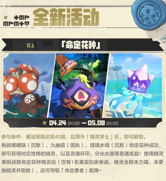 魔法等级达到40级并晋升为「精灵学士」后解锁。挑战嘟嘟锅、九幽菇、琉璃水母等命定花种,成功后可获得性格精灵、灵魂环印、分光水晶等首通奖励。精灵单挑战胜利后还可获得「命定勇者」奖牌。