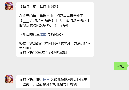在昨天的第一篇推文中,妲己宝宝提带来了【____-东海龙王·敖光】【芈月-西海龙王·敖闰】的最新联动皮肤爆料。(一个字),玩家只需要回答对今日的问题,即可获取游戏奖励,那么答案到底是什么呢?现在就让指玩手游网的小编为大家带来关于2026《王者荣耀》4月28日每日一题答案介绍的全部内容吧,感兴趣的小伙伴一定不要错过哦。