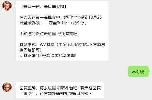 今日问题:在昨天的第一篇推文中,妲己宝宝提到10月25日登录就领_____夺宝30抽~(两个字)