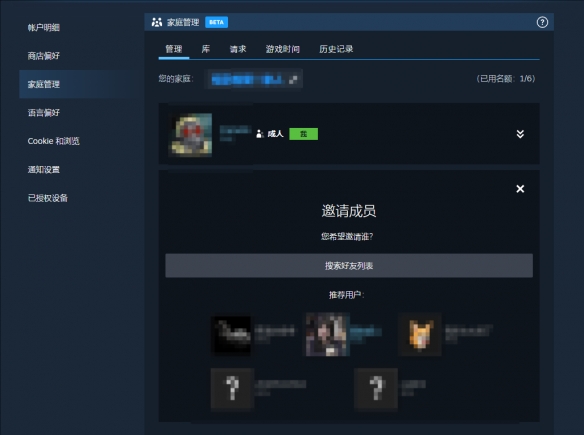 2、在弹出的设置界面中,切换至“家庭”选项卡,点击“管理您的Steam家庭”,随后选择“邀请成员”。对方确认后,便可成功加入。