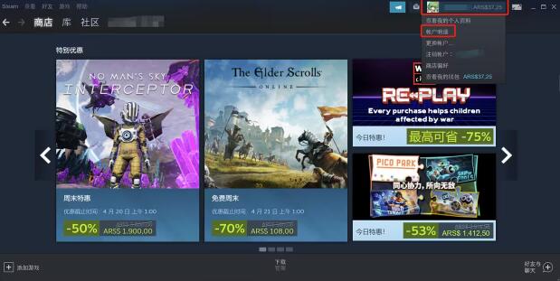2、首先,打开 Steam 客户端,点击界面右上角的“账户明细”入口,进入相关设置页面。