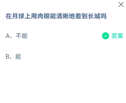 在月球上用肉眼能清晰地看到长城吗?用户们答对问题即可获得饲料,那么现在就让指玩手游网的小编为大家带来关于《支付宝》10月24日每日一题最新答案介绍(2)的全部内容吧,感兴趣的小伙伴一定不要错过哦。