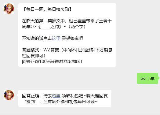今日问题:在昨天的第一篇推文中,妲己宝宝带来了王者十周年CG《_____之约》~(两个字)