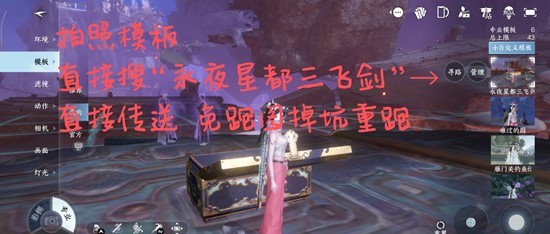 可使用自定义拍照模板快速传送:拍照 → 模板 → 搜索“永夜星都三飞剑-寻路”。